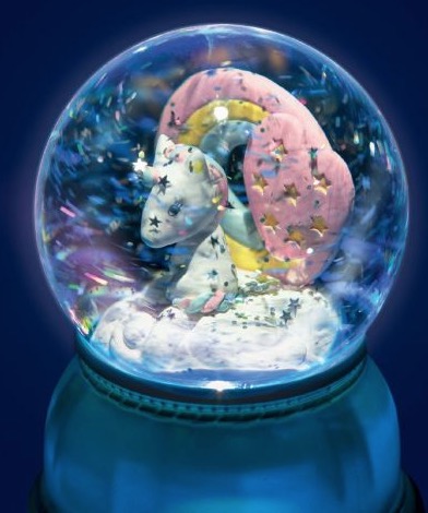 Cette veilleuse au socle bleu clair est une boule neigeuse, nul besoin de la secouer, un mécanisme fait tournoyer les paillettes autour de la licorne et diffuse une douce lumière de différentes couleurs.