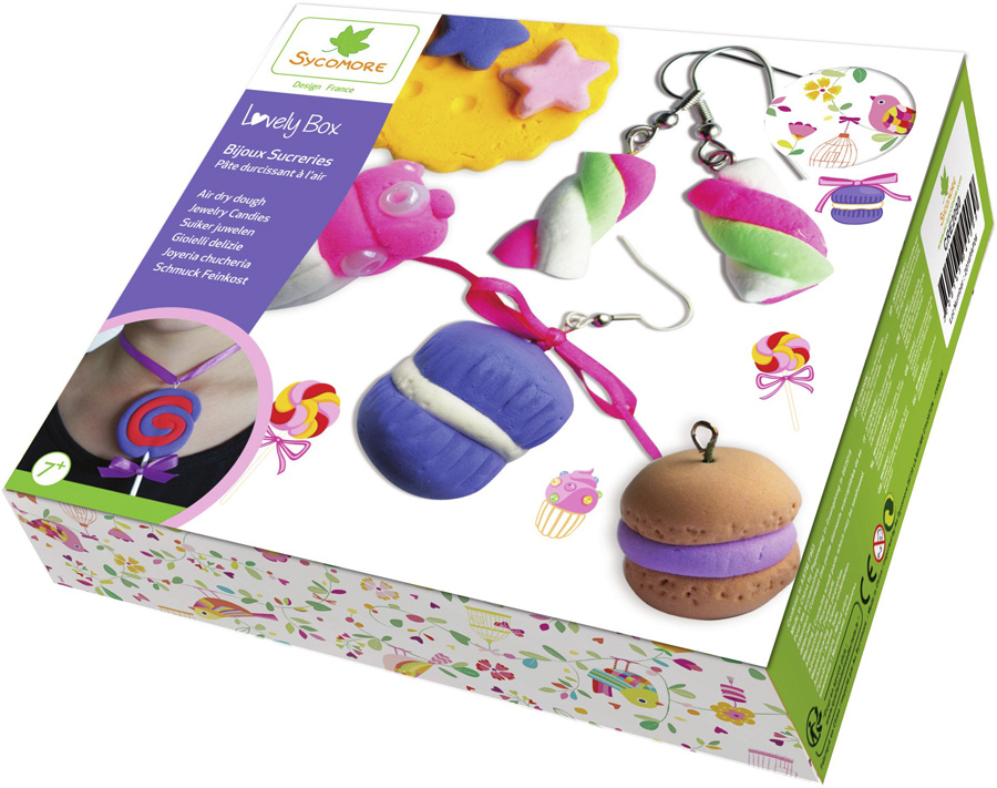 Crée de jolis bijoux colorés en forme de sucreries grâce à cette jolie boite à collectionner ! Sucettes, macarons, cupcakes, carreaux de chocolats et bien d'autres gourmandises à afficher comme accessoires de mode. Grâce au livret d'instructions inclus, apprends à réaliser des boucles d'oreille, des bagues et des colliers. Une fois la technique maitrisée, amuse toi à en faire de toutes les couleurs et crée tes propres modèles. Cette Lovely box contient : 6 pains de pâte qui durcit à l'air, 1 support bague, 1 support de broche, 1 paire de crochet boucle d'oreille, 4 clous à oeil, 1 ruban de satin, 1 batonnet, 1 sachet de perles colorées, 1 livret d'instructions.