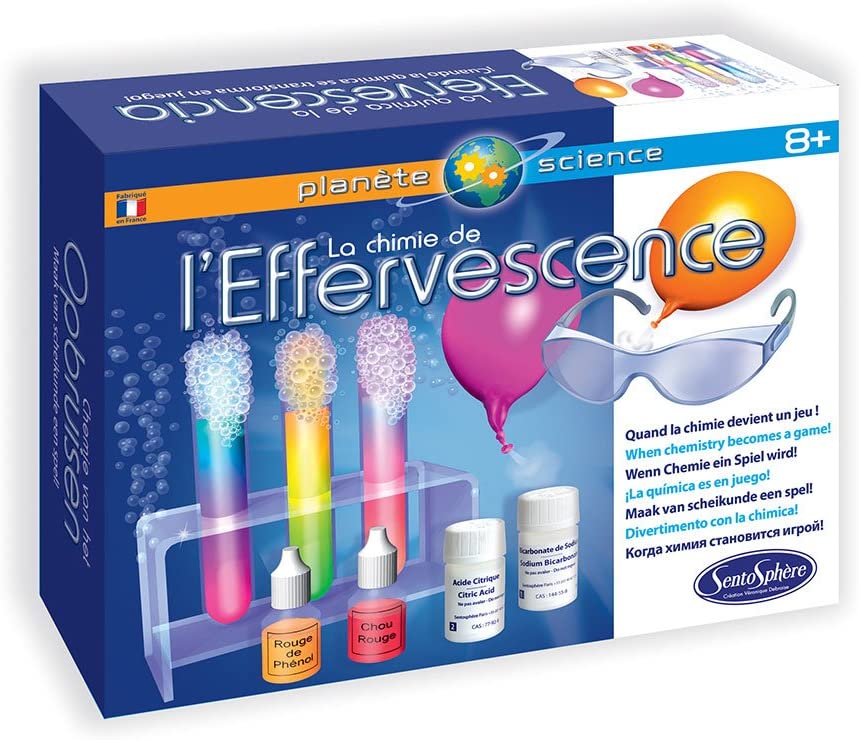 un kit scientifique pour découvrir l'univers de la chimie à travers des expériences ludiques. La Chimie de l'Effervescence propose de découvrir l'univers mystérieux de la chimie grâce à des expériences aussi spectaculaires qu'amusantes : créer une réaction d'effervescence dans un tube à essais, mesurer le pH de l'eau, ou encore observer des changements de couleur dans une substance liquide… en toute sécurité bien sûr.