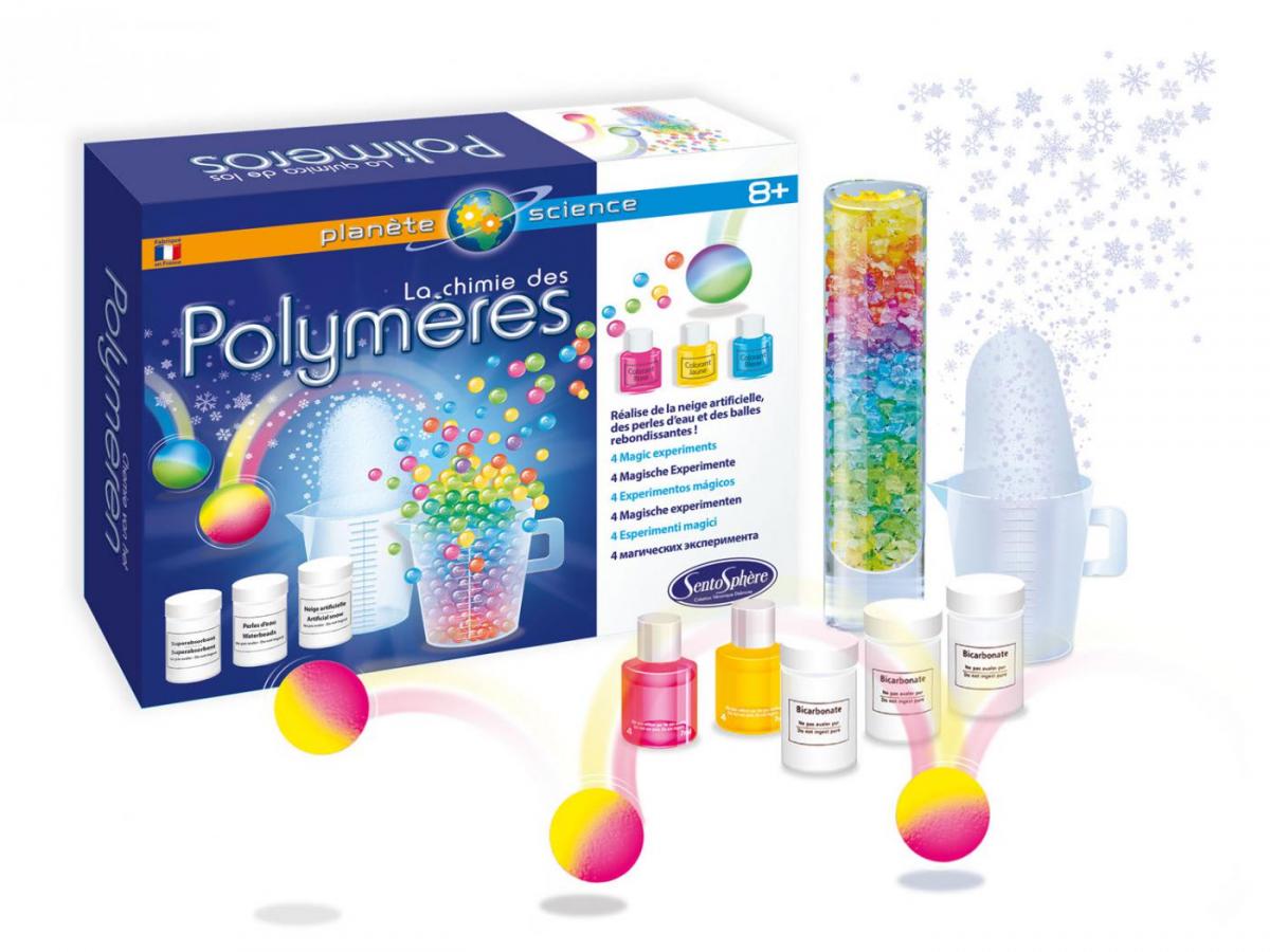 La Chimie des Polymères, un kit scientifique pour découvrir les surprenants pouvoirs des molécules Polymer en créant de la neige artificielle, ou votre propre balle rebondissante par exemple.