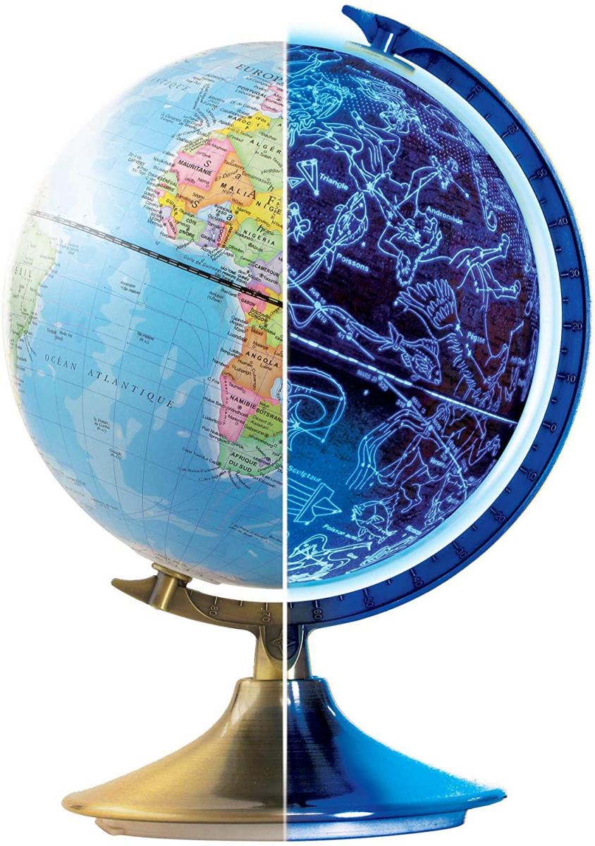 Ce globe de 21CM de diamètre monté sur armature métal (laiton) montre le jour la terre avec les frontières politiques et les éléments naturels tels que les mers,les lacs, les fleuves et les chaînes de montagne.Les capitales sont montrées d´un étoile et les autres villes importantes énumérées pour chaque pays. La nuit,le globe s´allume automatiquement grâce à un capteur photosensible en montre les 88 constellations majeures visibles avec leur noms en français. Fonctionne sur secteur et livré avec adaptateur secteur 220V