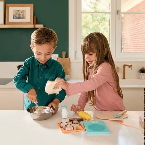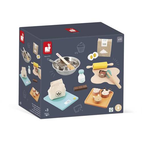 Un ensemble pour jouer les apprentis pâtissiers et imiter les grands. Un atelier pour petits et grands gourmands au bois garanti FSC et à la peinture à l'eau et qui comprend plusieurs accessoires : une boîte, un sachet, une bouteille, un oeuf, un bol, un fouet, une spatule, etc.