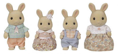 La famille Lapin Crème est composée de 4 personnages : la maman, le papa, le fils et la fille. Ils sont tous articulés et habillés avec soin. Leurs vêtements peuvent être enlevés et remis à loisir.
