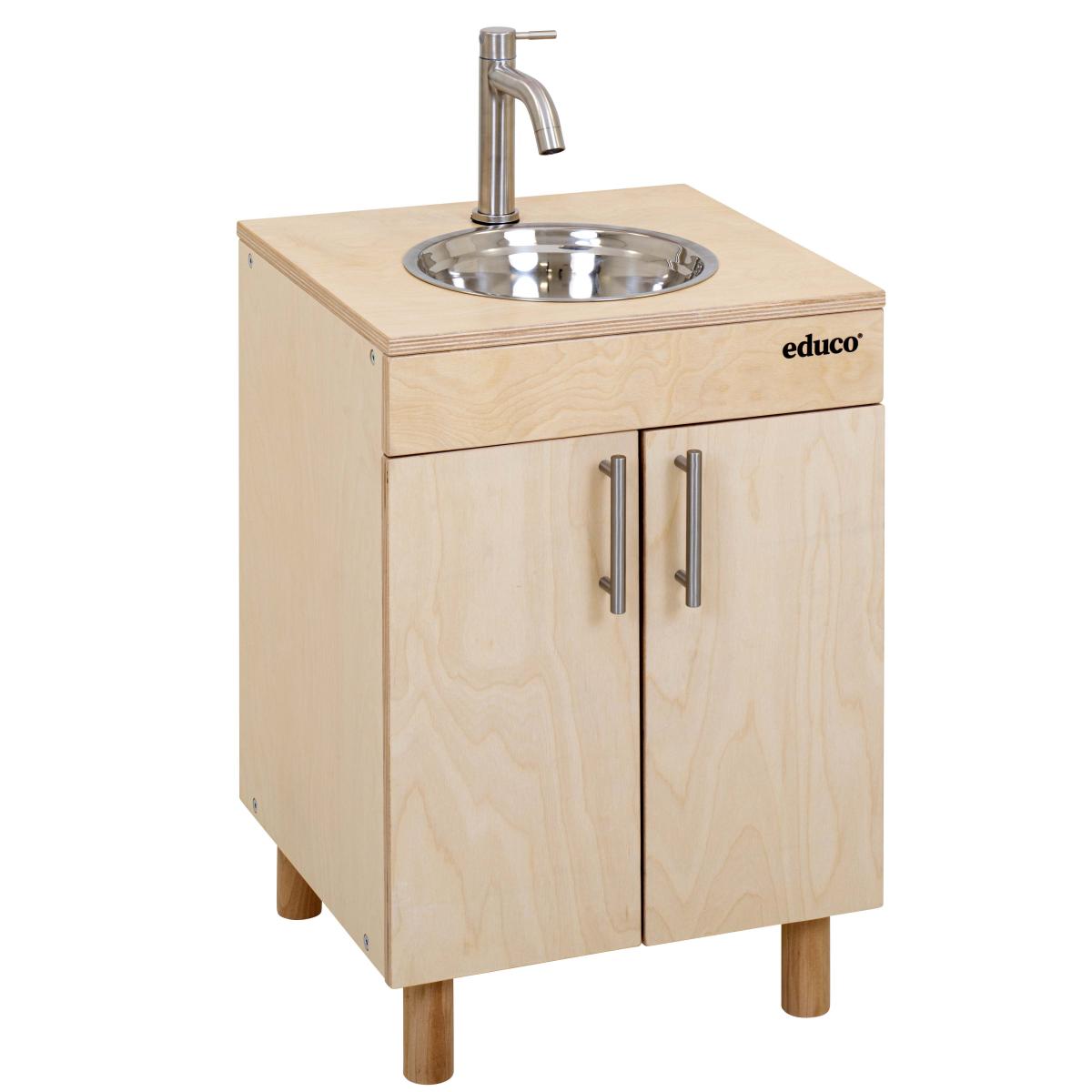 En utilisant une disposition réaliste du lavabo et des détails «réels» tels que le robinet métallique, l'évier et les poignées, le lavabo est très reconnaissable par les enfants. Tous les éléments Educo peuvent être assemblés comme une seule unité.