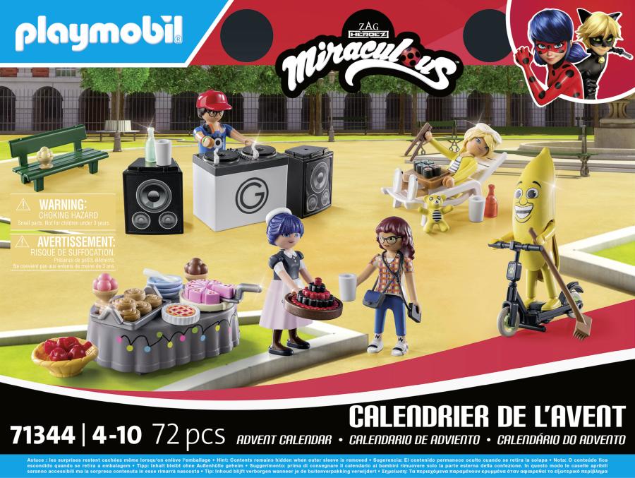 Transformation, Miraculous Ladybug ! Un calendrier de 24 cases qui comprend cinq personnages, un pique-nique et des accessoires.