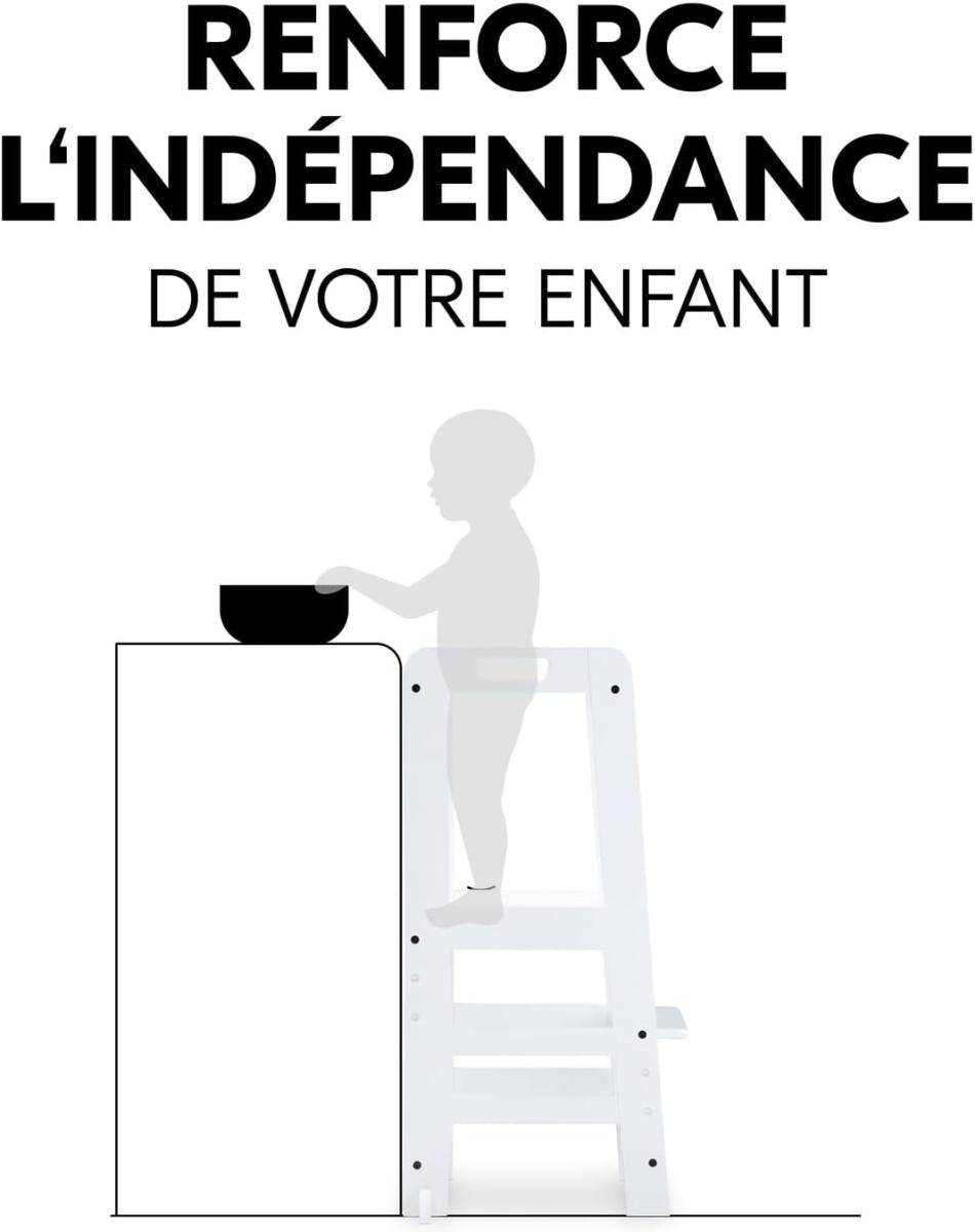 Learn N Explore - Tour d'apprentissage pour une découverte autonome Tour Montessori en bois certifé FSC® Grâce à la position surélevée. votre enfant peut faire des différentes activités à la hauteur des yeux. renforcant son sentiment d'appartenance. Selon le principe Montessori ""Aide-moi à le faire moi-même"". votre enfant assume des tâches dès son plus jeune âge. p. ex. en cuisinant ou en faisant de la pâtisserie. La tour est fabriquée en bois européen provenant de forêts certifiées FSC® qui accordent une grande importance à une exploitation durable et écologique afin de protéger les plantes et les animaux. Évolutive. stable et multifonctionnelle En fonction de la taille de votre enfant. vous pouvez régler la planche de support sur l'une des 3 hauteurs. La tour est stable et convient jusqu'à 40 kg. Votre enfant peut utiliser la tour d'apprentissage dans la cuisine. la table à manger ou également dans la salle de bain. Utilisation facile. pratique et sûre Les outils pour le montage sont fournis avec la tour et la planche se règle à l'aide de deux vis. Le design de la tour est adapté au look des chaises hautes en bois hauck et est disponible dans de différentes couleurs. vous permettant de l'intéger facilement dans votre intérieur.