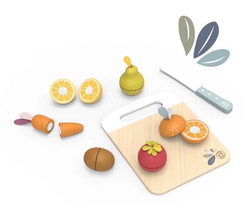 boites de fruits et legumes en bois à découper avec planche et couteau .