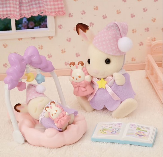 Ce coffret Sylvanian contient le bébé lapin Chocolat et la sœur lapin Chocolat qui s'appelle Freya ainsi que des accessoires pour le rituel du coucher. Le bébé lapin Chocolat a les yeux fermés, il dort paisiblement. Placez la marionnette sur la main de Freya pour amuser bébé lorsqu'il se réveille.