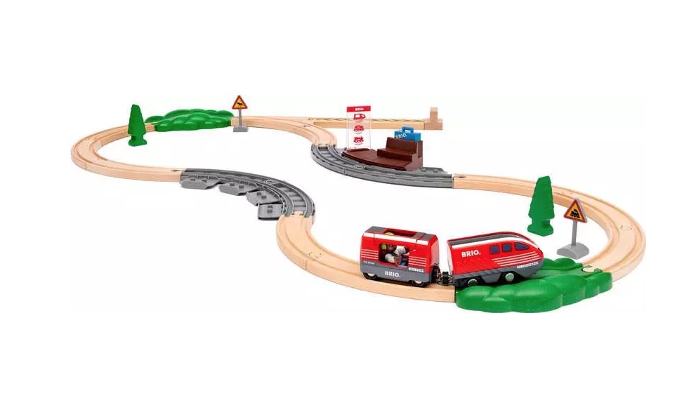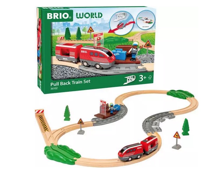 - Le 36102 Circuit de train à rétrofriction comprend 28 pièces : 1 train à rétrofriction, 1 wagon de passager, 1 figurine de passager, 1 quai de gare, 4 rails de quai de gare, 2 arbres en bois, 2 rails décorés, 12 rails en bois et plusieurs accessoires.