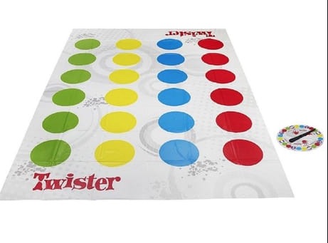 Fais tourner la roulette et suis les mouvements donnés par la roulette ! Tous les joueurs déplacent leur main ou leur pied le plus rapidement possible sur la pastille de couleur annoncée. Attention, il doit y avoir seulement un pied ou une main par pastille de couleur. Si 2 joueurs se retrouvent sur une même pastille, seul le 1er arrivé peut y rester. Si ton genou ou ton coude touche le sol, ou si tu tombes, tu es ÉLIMINÉ ! Le dernier joueur encore debout a gagné !