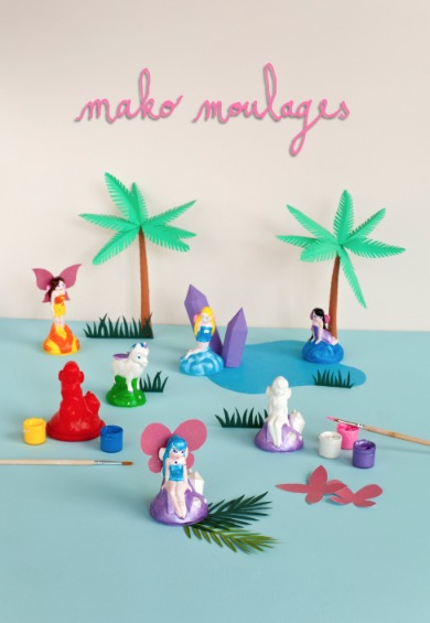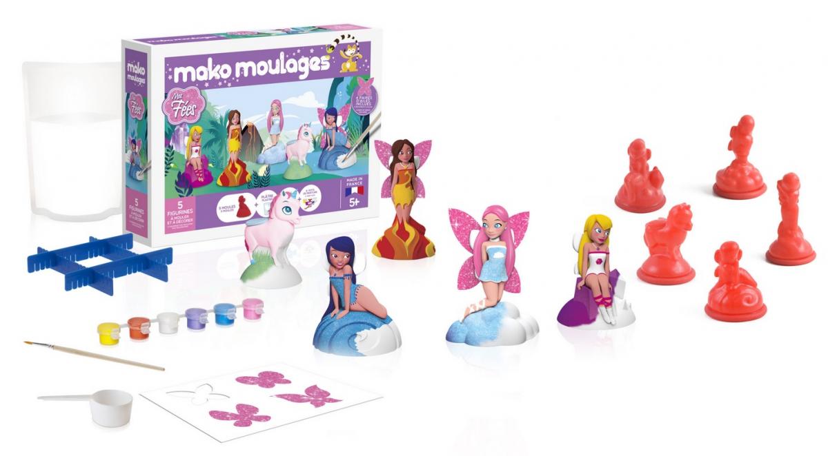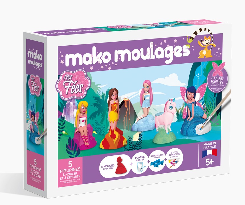 Moule et démoule tes 4 fées de la nature mako moulages et leur licorne ! Décore-les avec les 6 mini pots de peinture nacrée, pailletée et fluo. Donne vie a tes créations en découpant et en collant tes ailes pailletées ! Mako moulages, de la joie au bout des doigts ! Contenu : 5 moules en latex (fées de l'eau,de l'air, de la terre,du feu et une licorne), 1 sachet zippé refermable de 800g de plâtre, 6 pots de peinture 5ml (jaune, rouge, blanc nacré, bleu pailleté, violet nacré et rose). 4 croisillons, 1 pinceau, 1 cuillère doseuse, 1 notice de jeu et 1 planche de 4 paires d'ailes scintillantes !