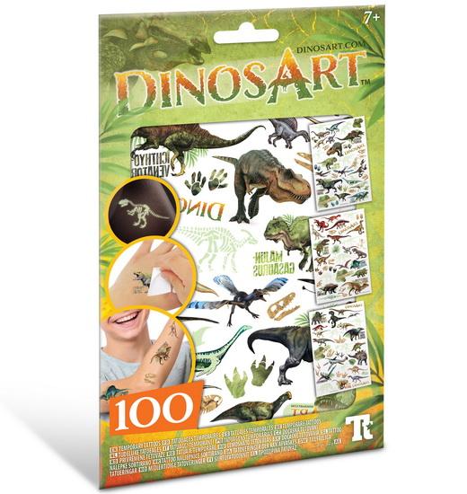 Pochette de 100 tatouages éphémères sur le thème des dinosaures.
