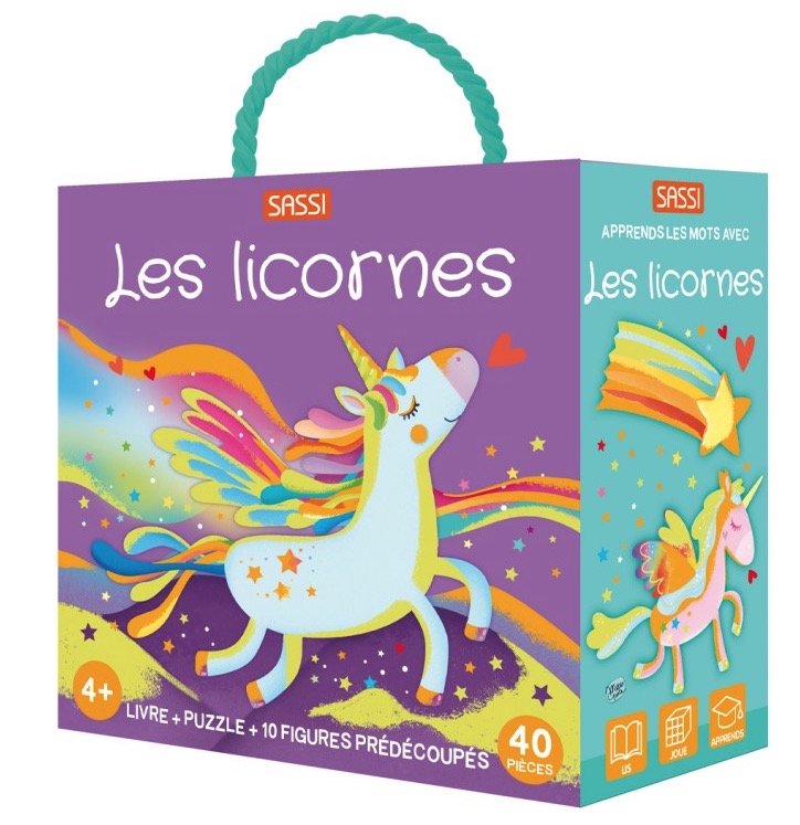 Une boîte décorée avec des détails brillants contenant un livre de 10 pages, un puzzle de 40 pièces et 10 silhouettes à assembler et à placer sur le puzzle, pour apprendre à reconnaître et à associer les éléments et les mots.