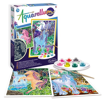 Aquarellum Phospho "Licornes" offre une expérience unique et magique. Ce serti phosphorescent, développé tout spécialement pour les 20 ans d'Aquarellum, permettra à vos créations de briller de mille feux une fois la lumière éteinte. Ces deux illustrations de licornes vous feront voyager, de jour comme de nuit, dans un univers féérique.