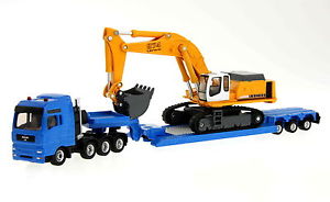 Le MAN TG-A dans sa version la plus impressionnante comme engin de traction pour convoi exceptionnel 4 essieux à l'échelle 1:87. Jantes tendance avec surfaces de roulement caoutchoutées. Représentation très détaillée des agrégats extérieurs et des tuyaux d'échappement derrière la cabine. Avec sellette d'attelage. Un semi-remorque surbaissé 3 essieux est attelé avec une pièce en col de cygne. La gorge est équipée d'une mécanique facilement manipulable par des mains d'enfants et peut donc ainsi facilement être séparée de la pièce en col de cygne. Cela permet l'imitation réaliste du processus de chargement original. Un gros excavateur de la marque Liebherr avec godet représente le chargement.