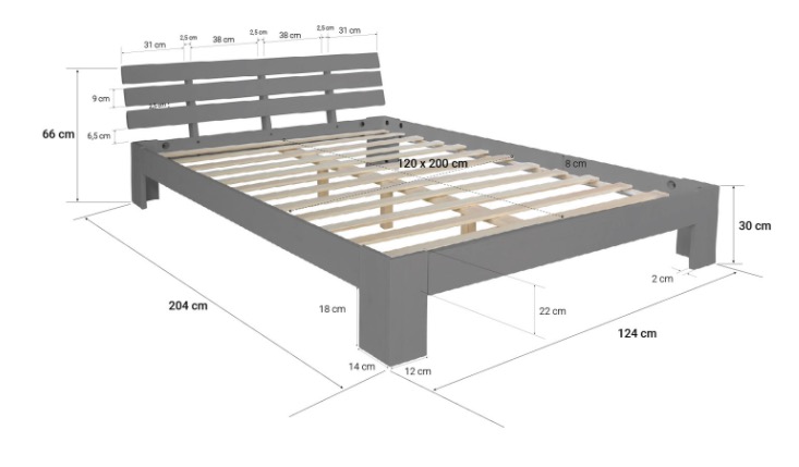 Dimensions extérieures du lit (L x P) : 124 x 204 cm