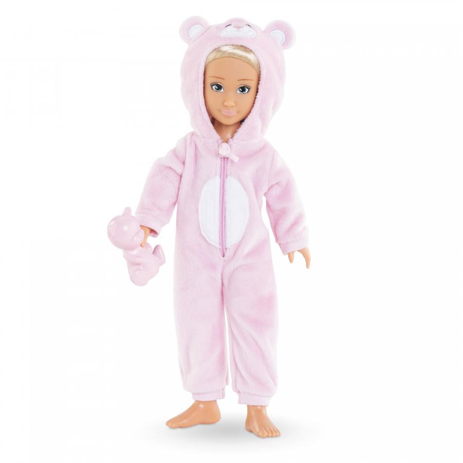 - Valentine a un joli visage naturel aux traits fins qui sent bon la vanille. Ses yeux sont peints et elle possède des cheveux blonds mi-longs. Elle porte une combi-pyjama ours rose toute douce.
