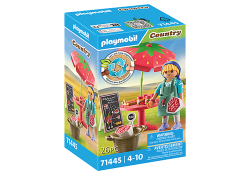 - Découvrez le coffret PLAYMOBIL "Vendeuse de confitures" ! Visitez le stand et goûtez à la douceur des fraises fraîchement cueillies. Ne manquez pas le délicieux gâteau aux fraises et la confiture de fraises acidulée. Ce set comprend un personnage PLAYMOBIL, une table, une pancarte, un sac à poignée rempli d'inserts de fraises fraîches, des pots de confitures et des accessoires. Le bandeau de cheveux, le bracelet et le tablier de la vendeuse peuvent être retirés. La nouvelle gamme Ferme est fabriquée avec plus de 80% de matériaux recyclés ou biosourcés en moyenne.