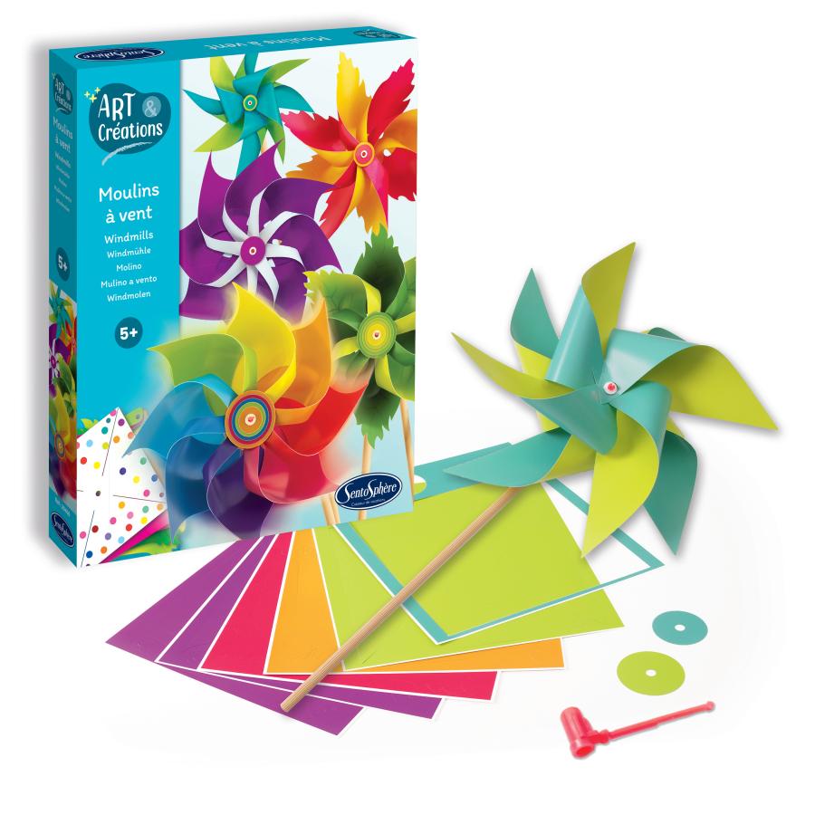 De jolis moulins à vent bicolores à fabriquer avec du papier imprimé recto-verso.