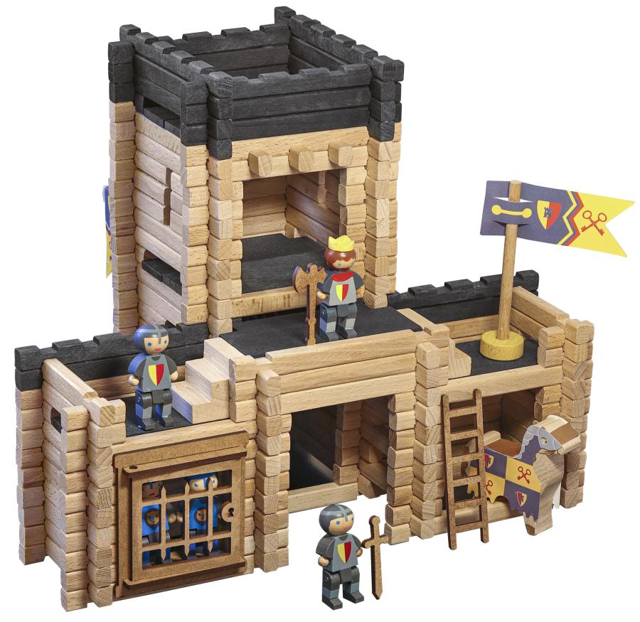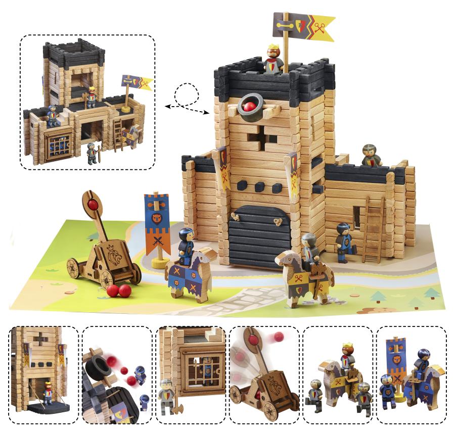 Château Fort et Catapulte - 270 pièces : jeu de construction en bois naturel et teinté avec une notice de montage, un tapis de jeu et de nombreux accessoires pour vivre de grandes aventures de chevaliers. Valisette carton : 53 x 32 x 11 cm. A partir de 5 ans.