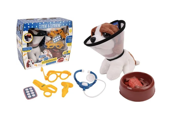 Un chien assis de 18 cm avec accessoires et gamelle.