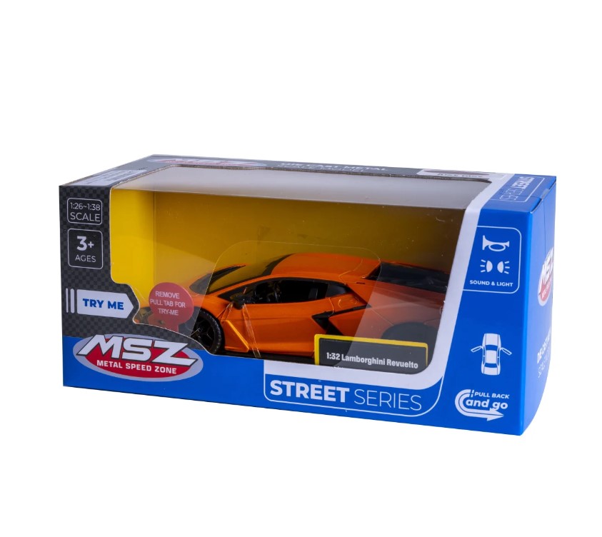 Le Lamborghini Revuelto est la première supercar de série de Lamborghini équipée d'un moteur hybride V12, marquant le début d'une nouvelle ère dans l'histoire de la marque. Avec plus de 1000 chevaux, il allie une technologie électrique de pointe à la puissance classique de Lamborghini et une performance extrême. JAMARA propose ce véhicule unique en modèle DIECAST métallique de haute qualité à l'échelle 1:32 – avec de nombreux petits détails qui raviront chaque fan. Le Lamborghini Revuelto séduit par son intérieur fidèle au modèle original et un design élégant qui n'a rien à envier au véritable véhicule. Avec une cabine pour figurines, des effets sonores réalistes et un bruit de moteur authentique, ce modèle offre une expérience de conduite impressionnante. Les pneus en caoutchouc profilés et le pare-brise transparent confèrent au modèle un look particulièrement réaliste. De plus, les feux LED avant et arrière, ainsi que les portes et le capot qui s'ouvrent manuellement, ajoutent encore du plaisir de jeu. Le puissant moteur à retour et le bruit qui se déclenche en appuyant sur la carrosserie font de ce modèle un incontournable pour toute collection. Le Lamborghini Revuelto de JAMARA n'est pas seulement un véritable objet de collection pour votre vitrine, mais également un must pour tous les collectionneurs et passionnés de supercars italiennes.