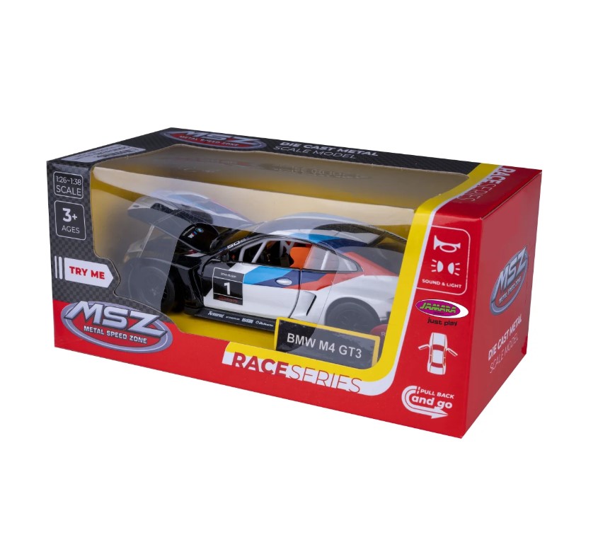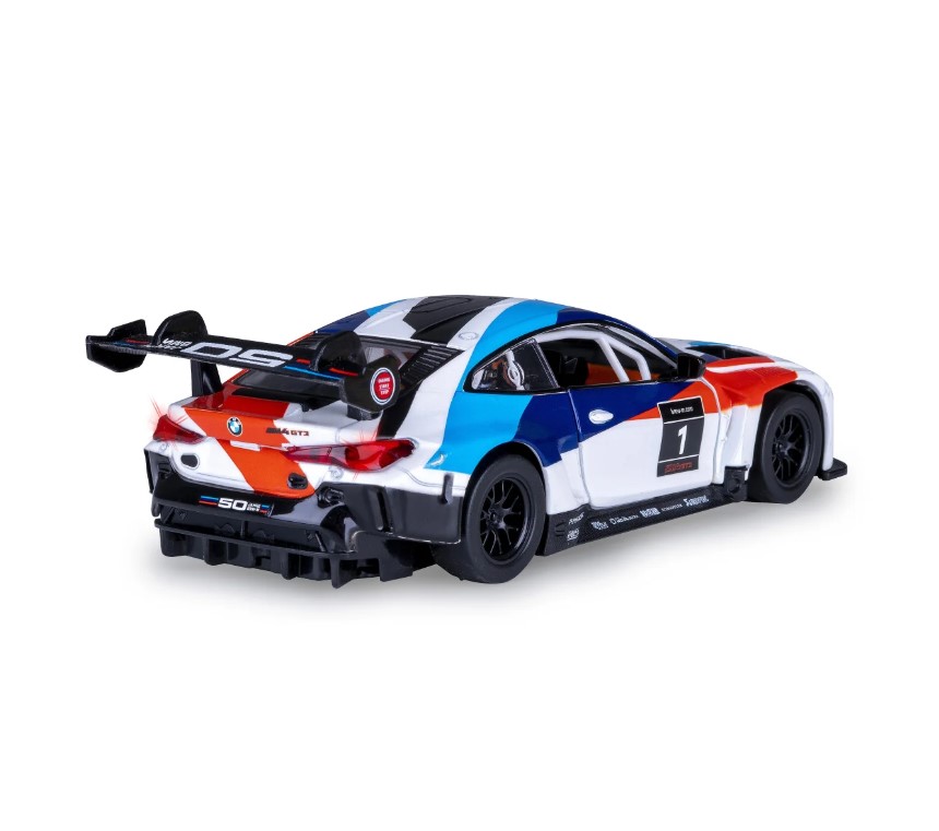 La BMW M4 GT3 est une voiture de course pure souche, conçue pour la compétition mondiale en catégorie GT3 et basée sur le modèle de série M4. Avec son puissant moteur six cylindres en ligne, son aérodynamique sophistiquée et sa technologie de course de pointe, elle incarne l'excellence de l'ingénierie BMW M Motorsport. JAMARA propose ce véhicule d'exception dans votre vitrine au format métal DIECAST de haute qualité à l'échelle 1:32 – avec une multitude de détails qui raviront tous les passionnés. Ce modèle officiellement licencié séduit par son design fidèle à l'original et son intérieur reproduit avec soin, incluant une cabine pour figurine. Les pare-brise transparents, les pneus en caoutchouc profilés et les lignes de carrosserie finement détaillées font de ce modèle une véritable pièce maîtresse. Les portes et le capot peuvent être ouverts manuellement, révélant des détails fascinants. Grâce au puissant moteur à rétro-friction, la voiture peut avancer toute seule d'un simple geste. Des effets sonores réalistes, comme le bruit du moteur, l'accélération et le son du déverrouillage à l'ouverture des portes, donnent vie à ce modèle de collection. Les feux LED à l'avant et à l'arrière complètent l'expérience. La BMW M4 GT3 de JAMARA est non seulement un véritable bijou pour votre vitrine, mais aussi un incontournable pour tout collectionneur et amateur de légendes du sport automobile GT.