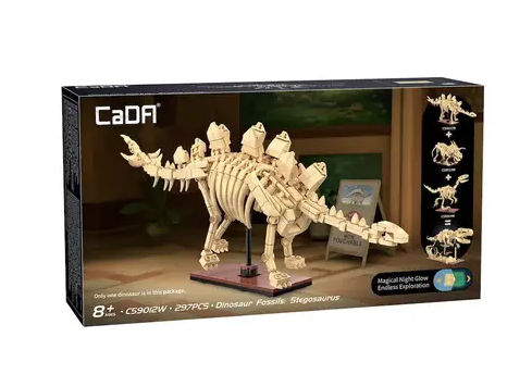 Fait partie de la série CaDA Brick Creative Series : ce squelette de stégosaure de 297 pièces brille dans le noir et dispose d'articulations mobiles pour des poses flexibles. Il peut être combiné avec le tricératops (C59013W) et le vélociraptor (C59014W) pour construire un tyrannosaurus rex plus grand