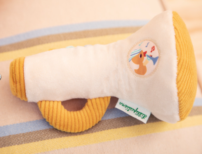 Bébé découvre la musique ! Avec ce hochet trompette, votre bout de chou éveille ses sens tout en douceur dès l'âge de 3 mois. À l'image de notre ami Gaspard le canard, toujours partant pour s'amuser, votre enfant prendra plaisir à imiter un véritable musicien en faisant semblant de jouer de la trompette ! Pour éveiller son ouïe, ce hochet émet de joyeux sons de « Pouet » et de papier froissé et offre également différentes textures et de petits anneaux colorés pour favoriser l'exploration tactile. Trop pratique, une poignée adaptée aux petites mains est prévue pour que l'enfant puisse facilement attraper l'instrument. En agitant simplement le hochet en peluche ou en reproduisant les gestes des plus grands, votre enfant profite d'une expérience sensorielle complète ! En plus de stimuler les sens des petits, ce hochet doux encourage l'imagination et l'imitation active. De quoi les divertir pendant de longues heures de jeu ! Grâce à son format pratique de 15 x 9 x 15 cm, ce hochet en peluche est parfaitement adapté aux bébés. Si vous recherchez un jouet d'éveil original, vous êtes au bon endroit ! Lavable en surface et composé à 76% de matières recyclées, ce hochet est en polyester. Offrez-lui dès maintenant son tout premier instrument de musique Lilliputiens !
